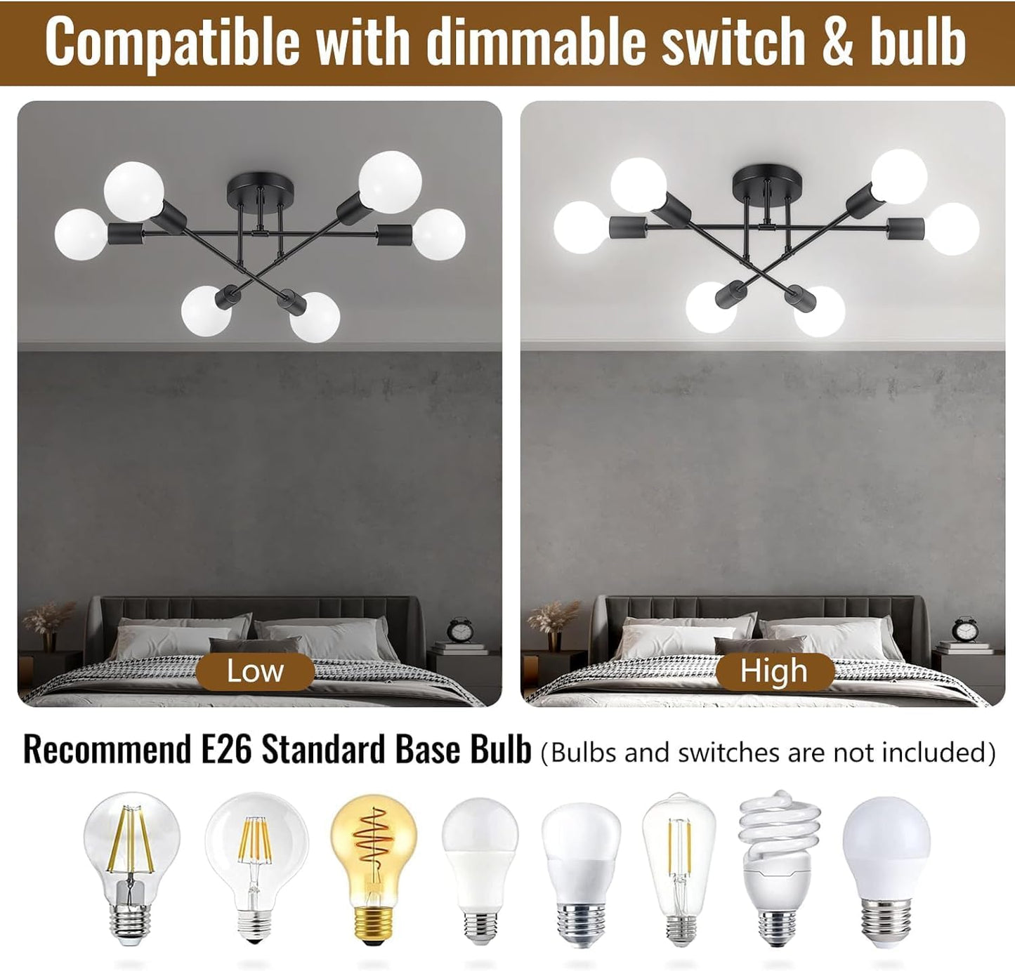 - The ceiling light is equipped with three heat-resistant E26 sockets (bulbs not included), compatible with LED, incandescent, CFL, and halogen bulbs. It also supports dimming functionality, allowing you to adjust the brightness and create a cozy atmosphere (dimmable bulbs and dimmer switch sold separately).